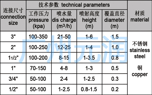 能夠噴出雄偉壯觀的巨大水柱,抗風(fēng)能力強(qiáng),該噴頭底部可有可調(diào)機(jī)構(gòu),可適用于不同角度的噴射要求,水柱垂直向上,粗狂挺拔,形似白玉塔,故稱冰塔或雪松,配上燈光,顯出有金塔、藍(lán)塔、紅塔之效果。